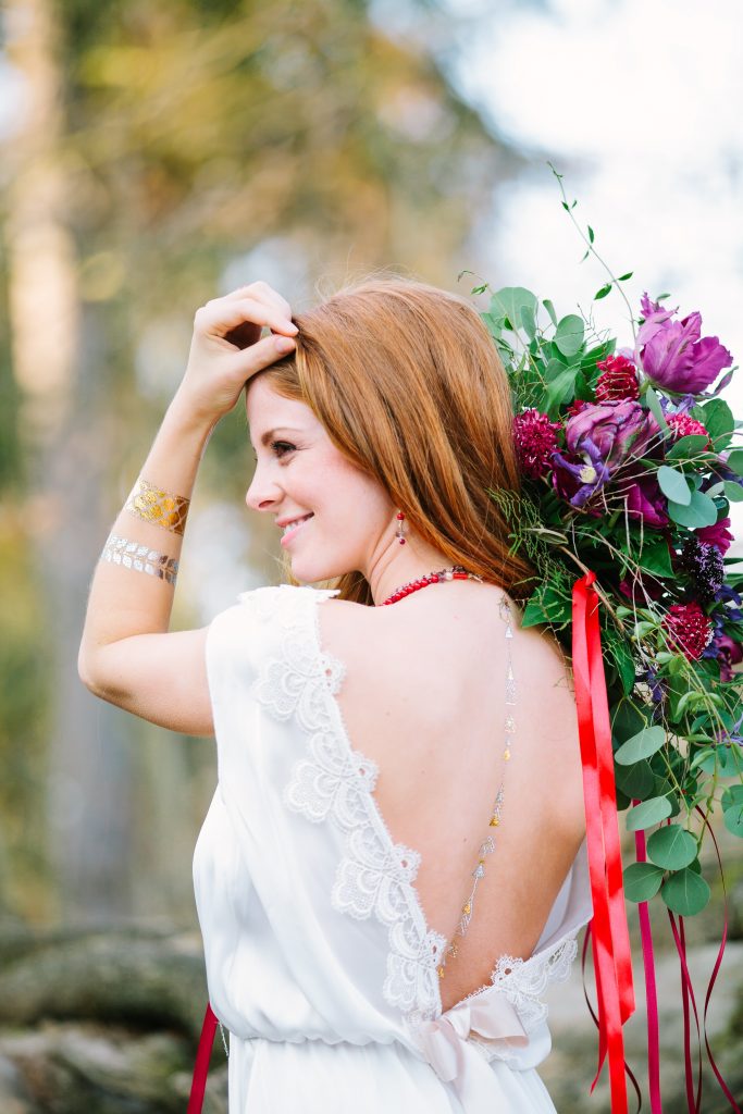 Fast surreal erhebt sich die Kulisse für dieses Shooting malerisch über dem Elbtal und beschert einem einen einzigartigen Ausblick. Endlose Weiten und zerklüftete Felsformationen so weit das Auge reicht, das Elbsandsteingebirge in seiner schönsten Form. Und mitten drin – Federn und Traumfänger im Wind, kräftiges Marsala hebt sich vom Grau der Felsen ab, ein natürliches, aber wildes und aufregendes Styling mit Gold und Silber-Akzenten. Die Naturverbundenheit und Impulsivität bilden einen perfekten Einklang und man kann den Bohemian Spirit nahezu greifen.
