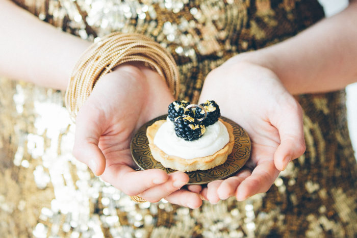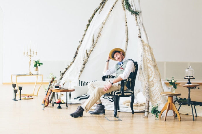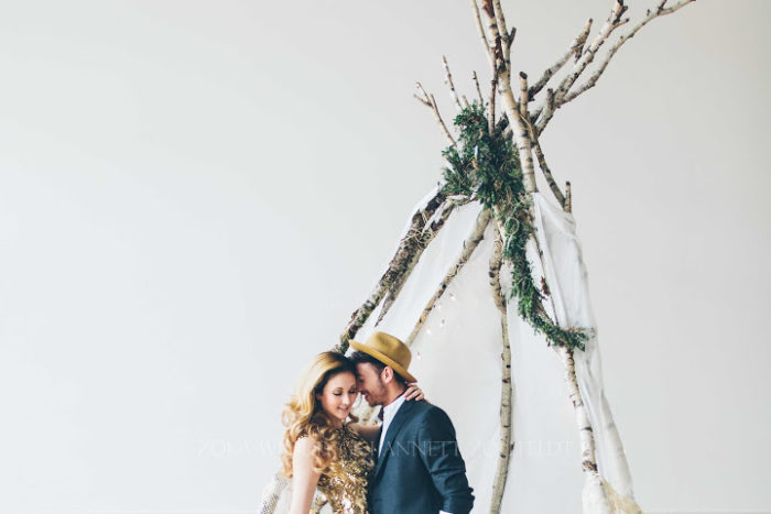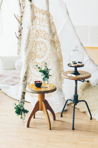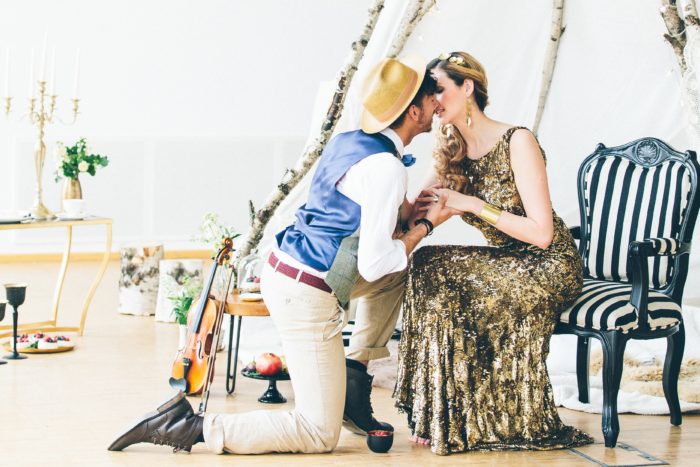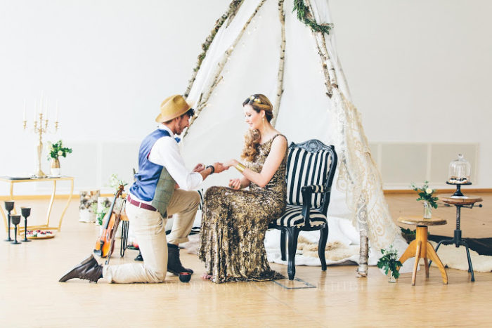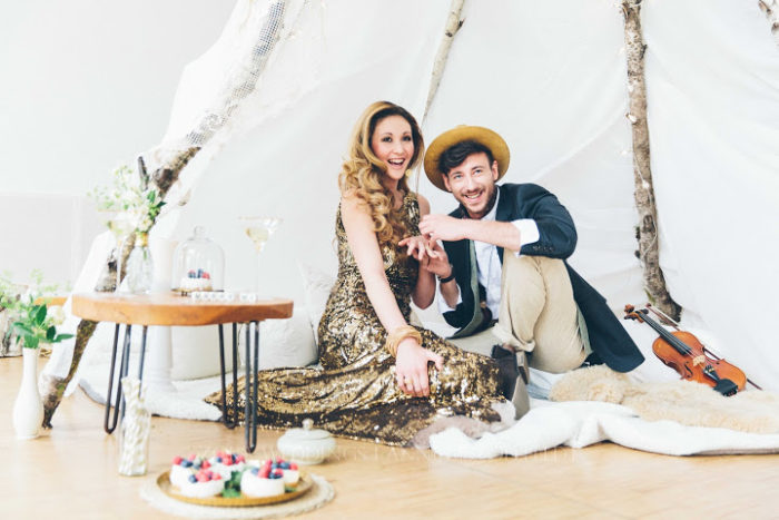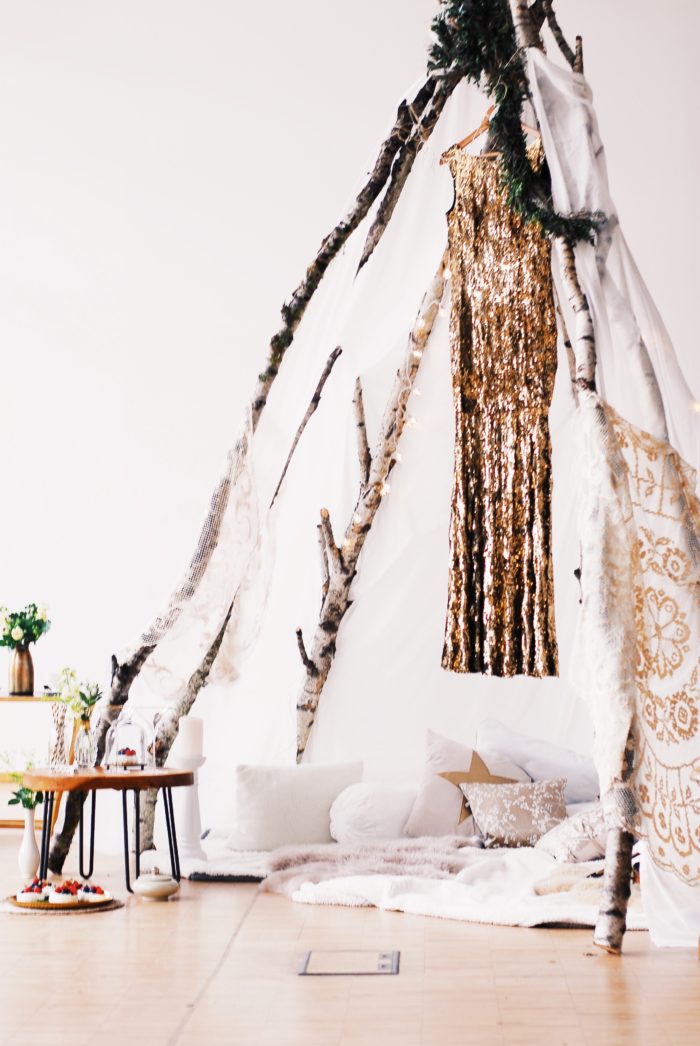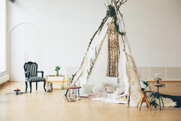 Ein liebevoll arrangiertes Tipi für eine besondere Zeit zu Zweit. Lichterketten geben dem ganzen einen gemütlichen Touch, und man will einfach nur die Zeit auskosten und in dieser magischen Szenerie verbleiben. Viele kleine Leckereien, die sich wundervoll genießen lassen, dazu Champagner und die Festlichkeit und Intimität des Momentes des Antrages ist vollkommen. Gold und Glitzer, sowie moderne Schwarz-Weiß Akzente bilden zu dem rustikalen Tipi einen eleganten und feierlichen Rahmen. Zusammen verweilen und die Besonderheit des Augenblicks für immer eingefangen.