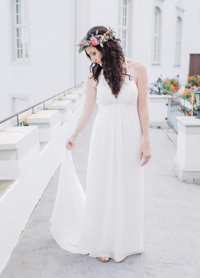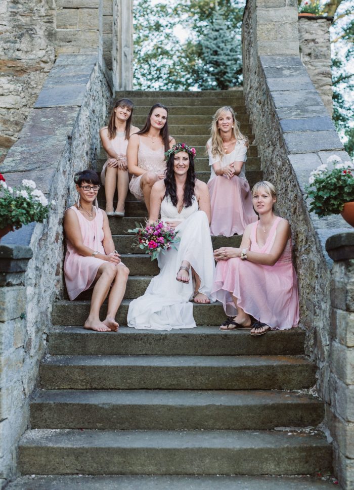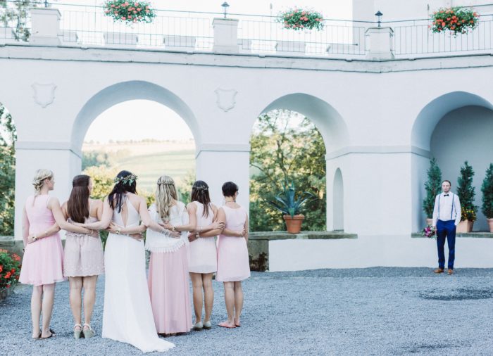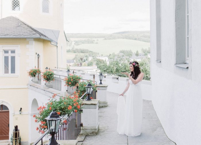 Grazil wie eine Elfe schwebte unsere Braut mit ihrem frisch Vermählten aus der Kirche, der Schleier wurde ausgetauscht und durch einen traumhaften Blumenkranz ersetzt. So wandelte sie mit ihren farblich perfekt abgestimmten Brautjungfern auf den Mauern des bezaubernden Schloss Purschenstein, mitten im Erzgebirge gelegen. So natürlich und zart, aber doch anmutig und stark. Der lichtdurchflutete Saal spiegelte genau dieses Gefühl wider. Die Papeterie auf Kraftpapier, mit Polaroid Fotos personalisiert, folgte diesem Konzept und gab die Reiselust des Brautpaares auf einzigartige Weise wieder. Heimatliebe – Fernweh. Unter diesem Leitgedanken wurden beide Leidenschaften in einer unvergleichlichen Symbiose vereint.