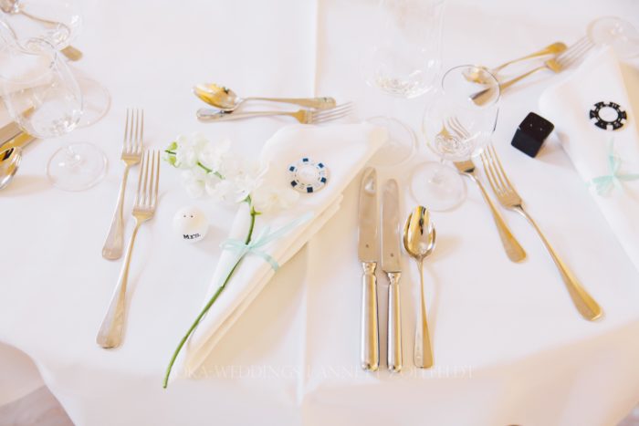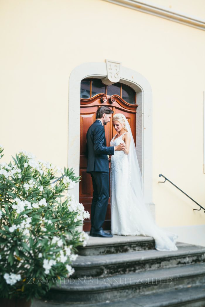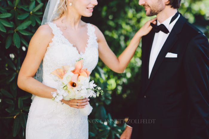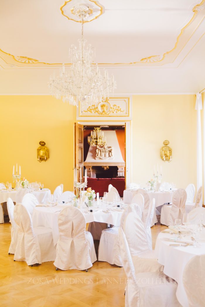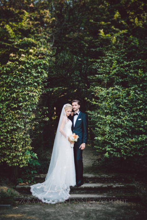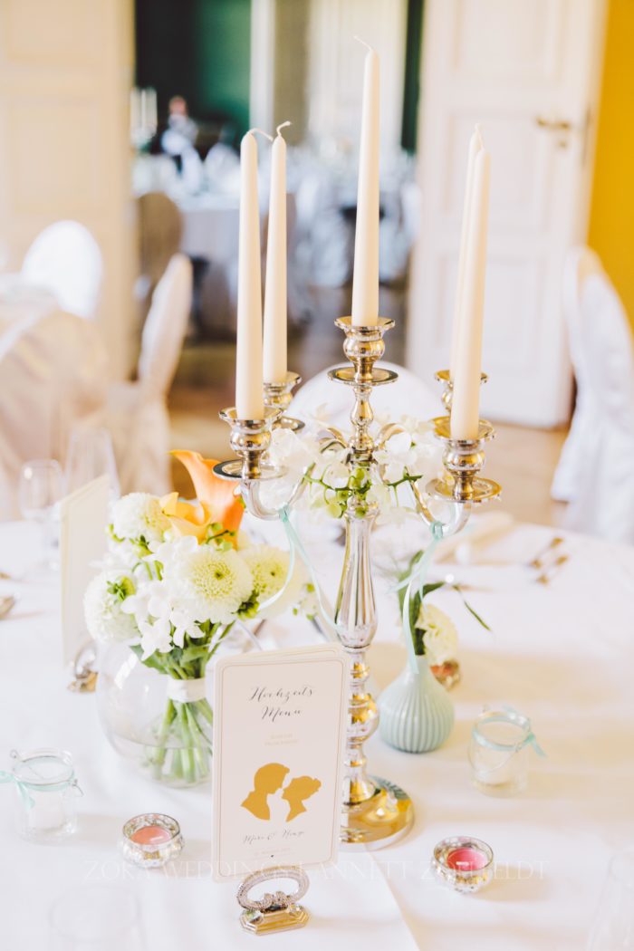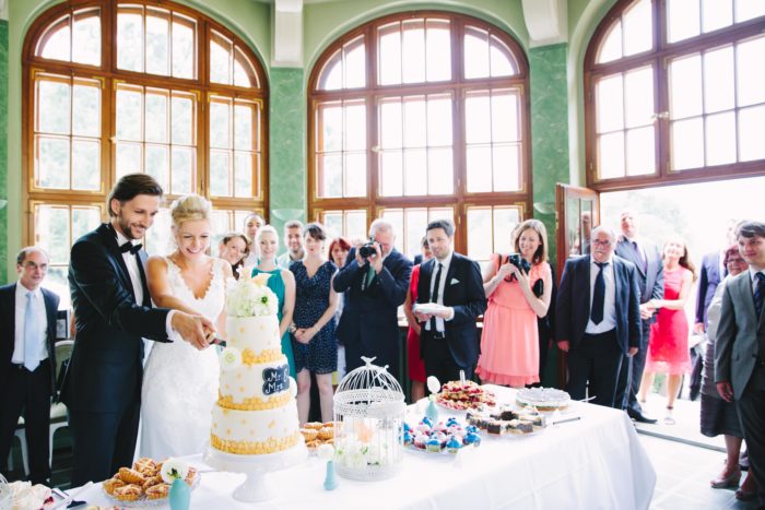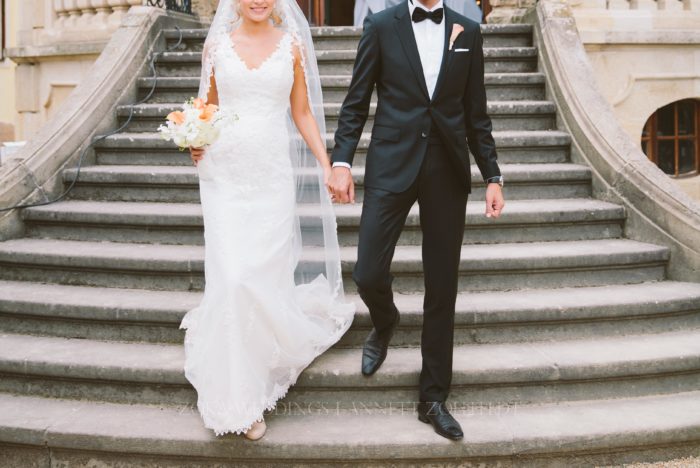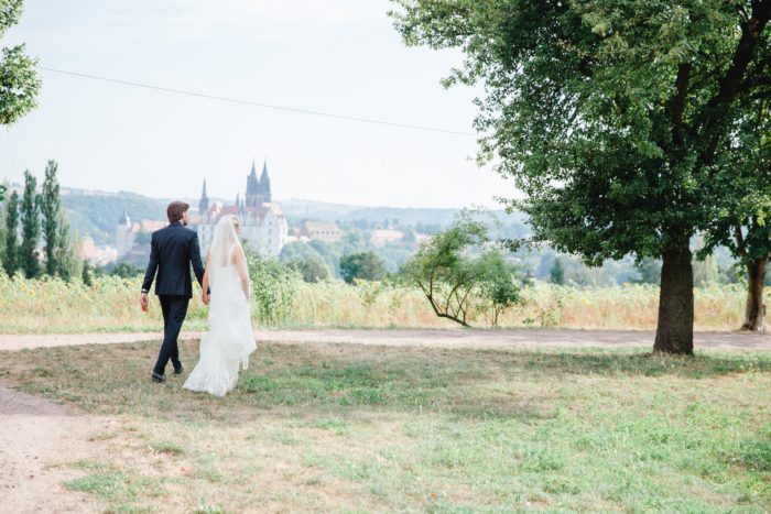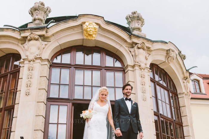 Die Schlösserdichte in und um Dresden ist unglaublich! Wenn man daran denkt, dürfen zwei Schlösser auf gar keinen Fall fehlen: Das malerisch über der Elbe liegende und prunkvolle Schloss Albrechtsberg und Schloss Proschwitz mit seinen Weinbergen in Meißen. Mara und Ringo haben sich beide Schlösser für ihre August-Hochzeit ausgesucht und die Kombination hätte schöner nicht sein können! Nach einer ganz besonderen standesamtlichen Trauung in einmalig typischen Dresden-Ambiente folgte eine Hochzeitsfeier auf Schloss Proschwitz, dessen Räumlichkeiten durch feine Details bestechen. Gold, Gelb und Creme gepaart mit Apricot-Tönen beherrschten die Feier und der Sommertag wurde dadurch zauberhaft leicht und zart. Braut und Bräutigam strahlten um die Wette und waren einfach nur happy – was wünscht man sich mehr?