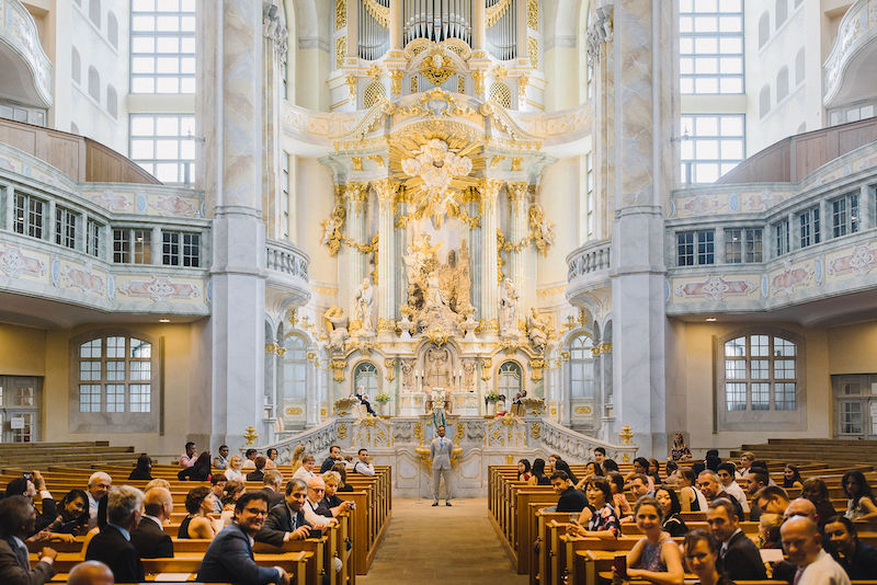 Wenn Braut und Bräutigam schon auf der ganzen Welt zuhause waren und Familie und Freunde dort auch verstreut sind, dann verspricht es ein besonders rauschendes Fest zu werden: von überall her reisten die Gäste des deutsch-holländischen Brautpaares an, kein Weg war zu weit und keine Mühen wurden gescheut. Den Auftakt am Hochzeitstag machte die gemeinsame Fahrt der Gäste und des Bräutigams in einer eigenen Straßenbahn bis in die Altstadt Dresdens. In dem einmaligen und erhabenen Ambiente der Frauenkirche fand die Trauung statt, kein Auge blieb bei dieser Atmosphäre trocken. Frisch getraut und alle Gäste wieder in der Straßenbahn verstaut ging es zurück zum Schloss Eckberg, wo der restliche Hochzeitstag stattfand. Magisch & berauschend – das war ein Fest für alle Sinne. Ein wunderbarer Spätsommertag im September.